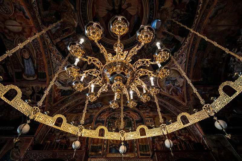 Разкошните полилеи в църквата на Троянския манастир.