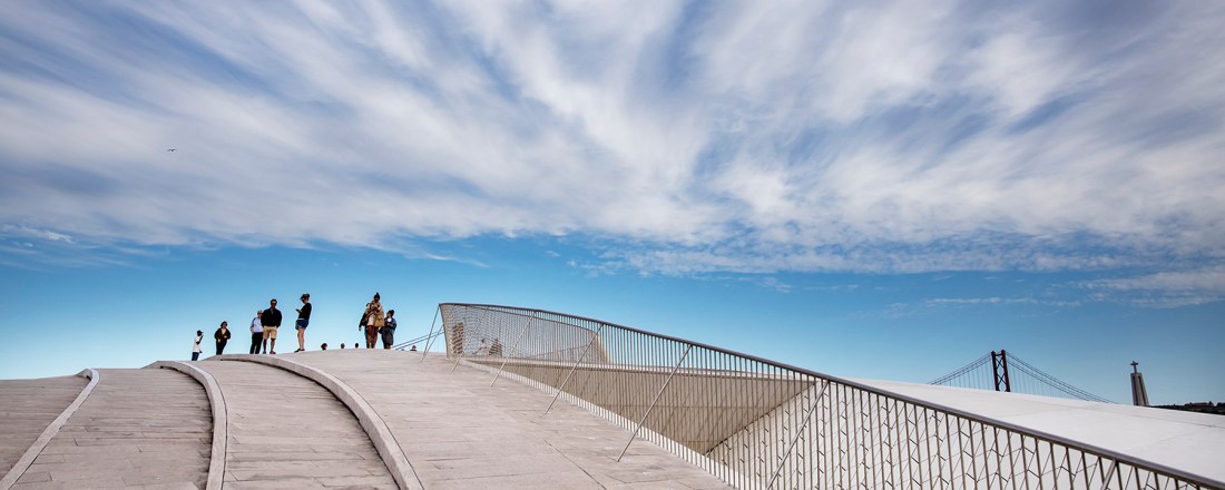 Следващата ни спирка беше музеят MAAT, който е на пешеходно разтояние от манастира Свети Жером. Музеят на изкуството, архитектурата и технологиите е разположен на брега на река Тежу. Футуристичната му сграда e проектиранa от лондонската архитектурна фирма Amanda Levete Architects. Фасадата е покрита с бели плочки, които отразяват светлината идваща от реката. Отраженията от водата създават неочаквани светлинни ефекти върху сградата. Покрива на сградата е панорамна площадка, на която имаше склуптури на съвременото изкуство.