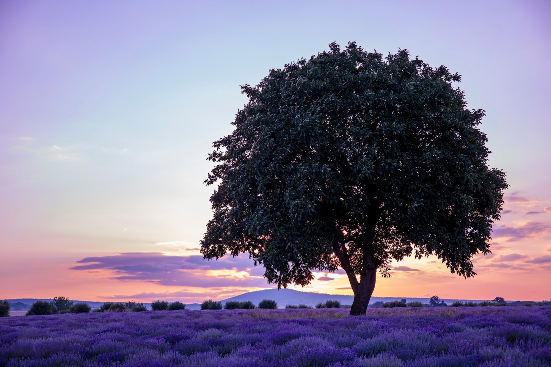 На следващата сутрин станахме в 4:30 сутринта за изгрева. Локацията беше поле, което намерихме случайно предходния ден. Освен вълните от лилави туфи, тук централен елемент от пейзажа беше дърво с красива корона. Лехите бяха разположени перпендикулярно на слънцето.