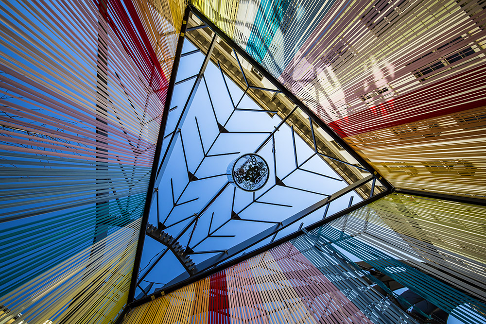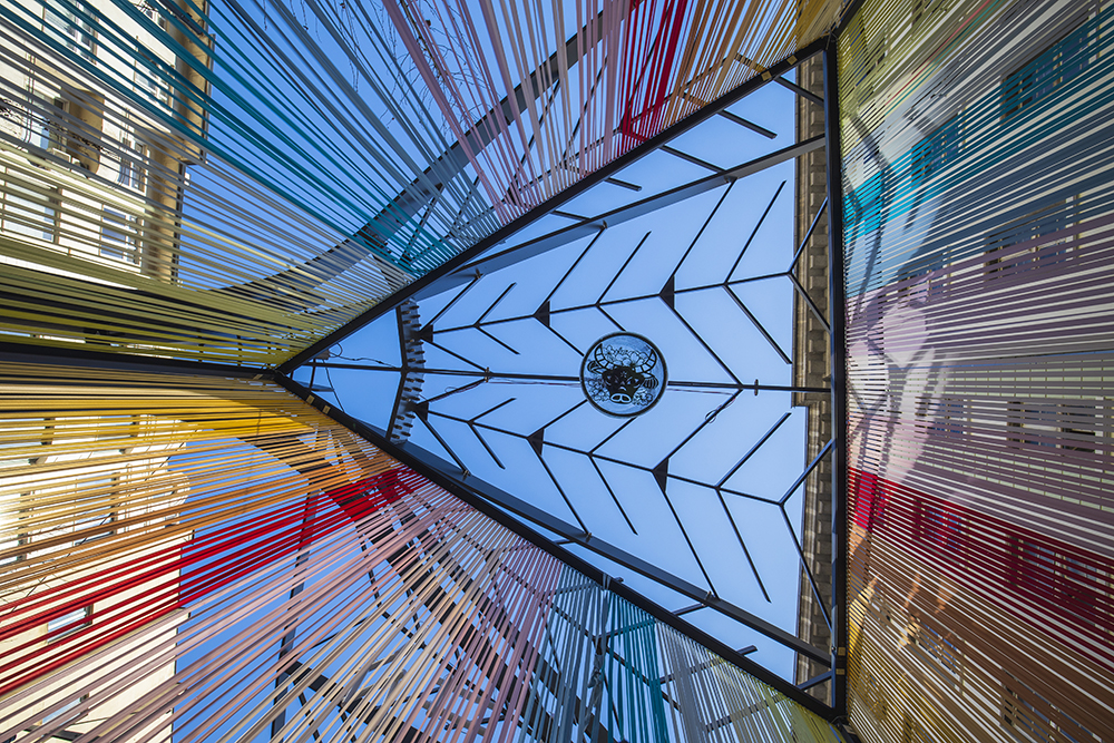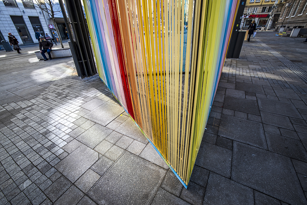 Шарена, свежа и с дъх на пролет. Така бих описал тази арт инсталация. Един цветен триъгълник, направен от ленти в пъстри цветове. Това ми е фаворита от всички творби, участващи в изложбата на площада.