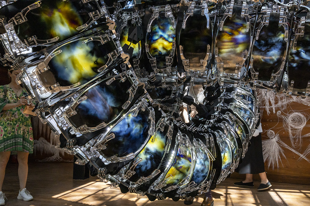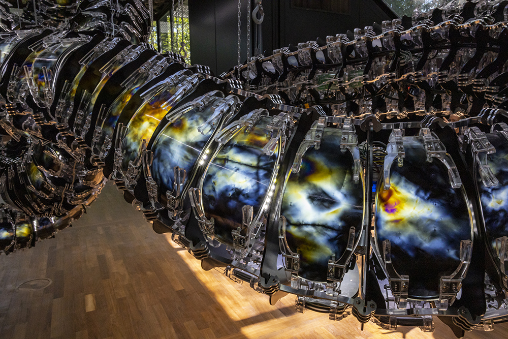Крома V е огромна змия с дължина над 50 метра, усукана около себе си в голям сложен възел. Тази гигантска скулптура е великолепно произведение, изработено от метал и материали, получени от нови техники. Тя е в центъра на Корейския павилион на Венецианското биенале 2022 г. Всяка от сглобките е математически генерирана чрез алгоритми, базирани на физиката. 382-те движещи се клетки, приличащи на драконови люспи, представляват прозрачни полимери. Вътрешно кинетично устройство провокира микроскопични деформации на полимерните слоеве и фрикция на повърхностите, която генерира промяна в цвета и яркостта. Сигналите, които детекторът за муоми, с името Аргос, улавя, провокират движението на полимерните слоеве в Крома V.