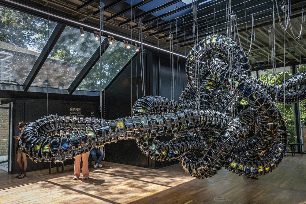 Изложбата Gyre изследва света като лабиринт, където има както движение в неподвижност, така и неподвижност в движение, обхващащи нечовешки обекти и материална реалност. Въз основа на трансдисциплинарните изследвания на художника – Юнчул Ким в литературата, митологията, философията и науката, той създава вселена в Корейския павилион, където неговите патафизични инсталации непрекъснато метаморфизират и са повлияни от космически събития, атмосфера, светлина и природа. Юнчул Ким е южнокорейски художник, който е създател на скулптури с материали от съвременни техники и композитор на електроакустична музика.