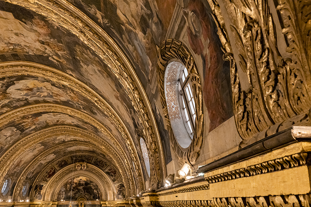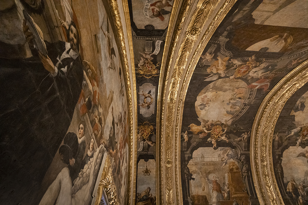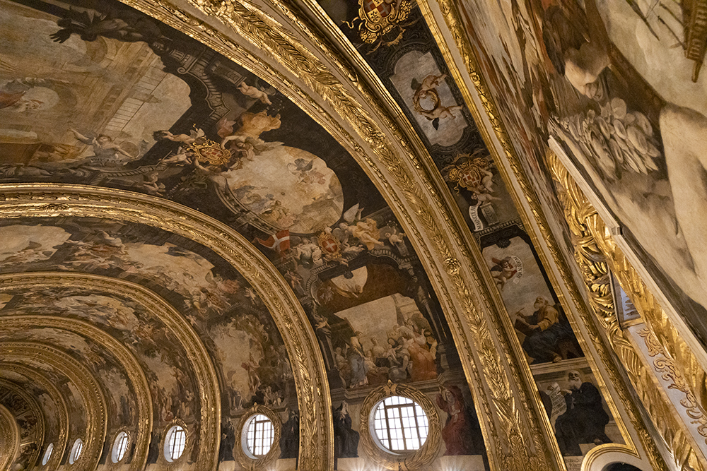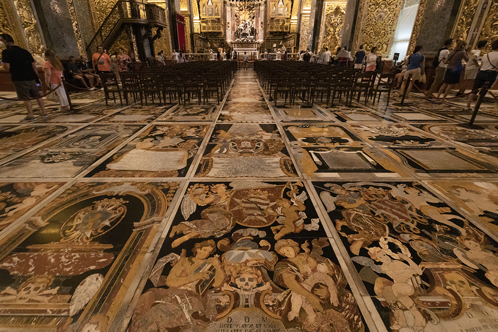 Огромния свод на централния кораб е разделен на шест отсека, всеки изобразяващ по три сцени от битието на Свети Йоан, от раждането до трагичната му смърт. Подът на катедралата е също толкова впечатляващ. Има над 400 мраморни инкрустирани надгробни плочи на погребаните рицари. Колкото по-важен е бил рицарят, толкова по близо до олтара е поставян.