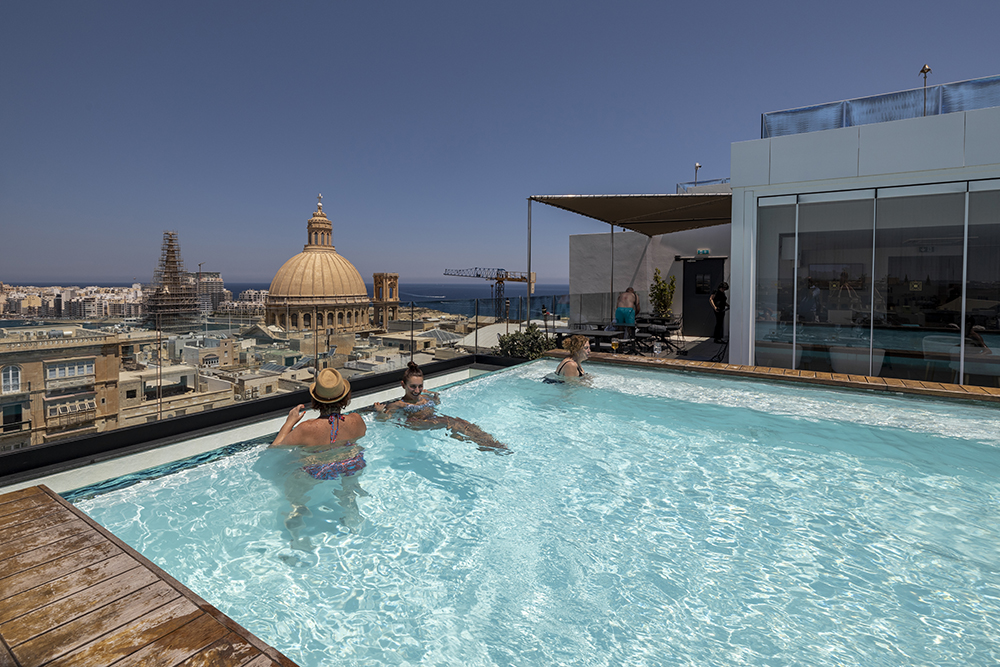 В хотел Embassy има хубав ресторант на покрива, с басейн и панорамна гледка към Валета и Слема. Лек обяд и чаша кафе ми дават нови сили за да продължа обиколката.
