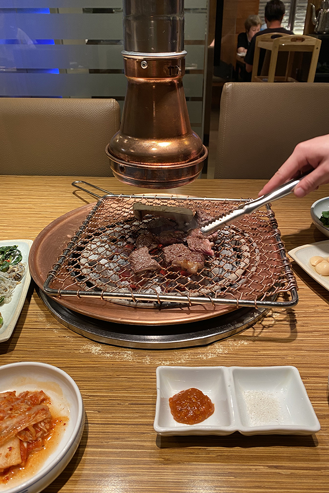 Корейското барбекю е едно много приятно преживяване. Месото се приготвя пред вас на самата маса, като на повечето места скарата е вградена в масата. Разбира се, има и такива ресторанти, където носят скарата и я поставят върху масата за хранене. Печенето е на дървени въглища или на газ. Телешкото е изключително крехко и сочно. Има свинско и пилешко също. Кой каквото предпочита. В Корея когато си поръчате едно ястие, на масата ви сервират още поне 5-6 малки купички с различни неща. Едно, от които е задължително кимчи. Различни сосове, салати и други.