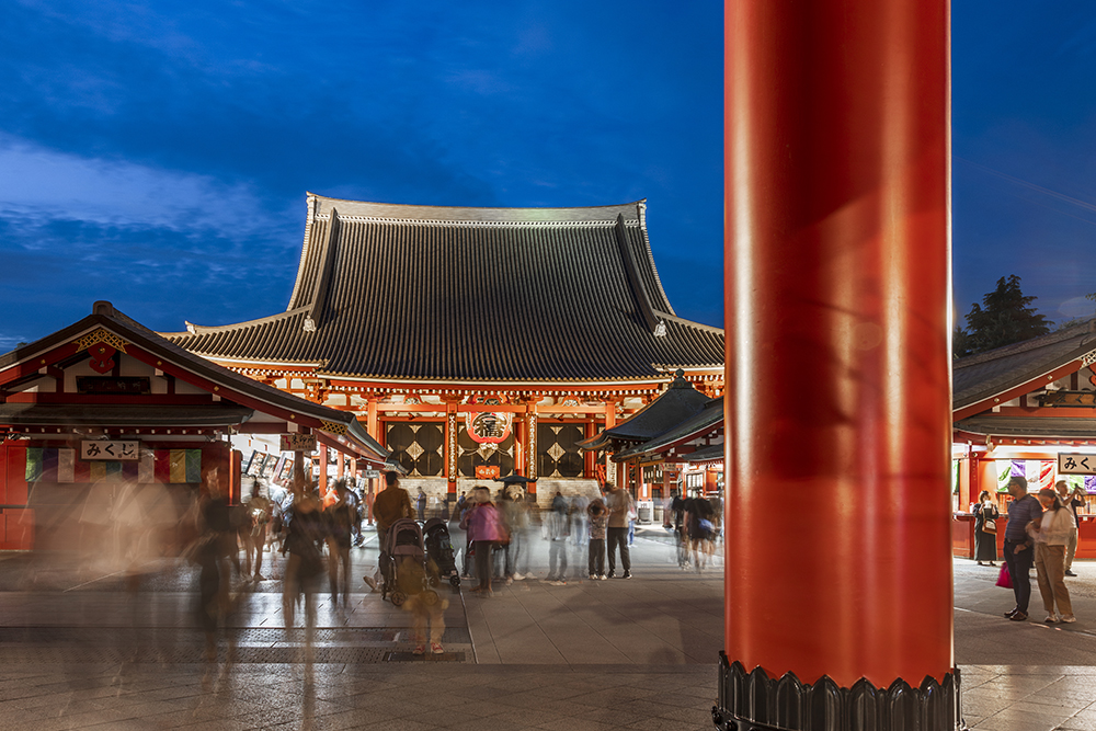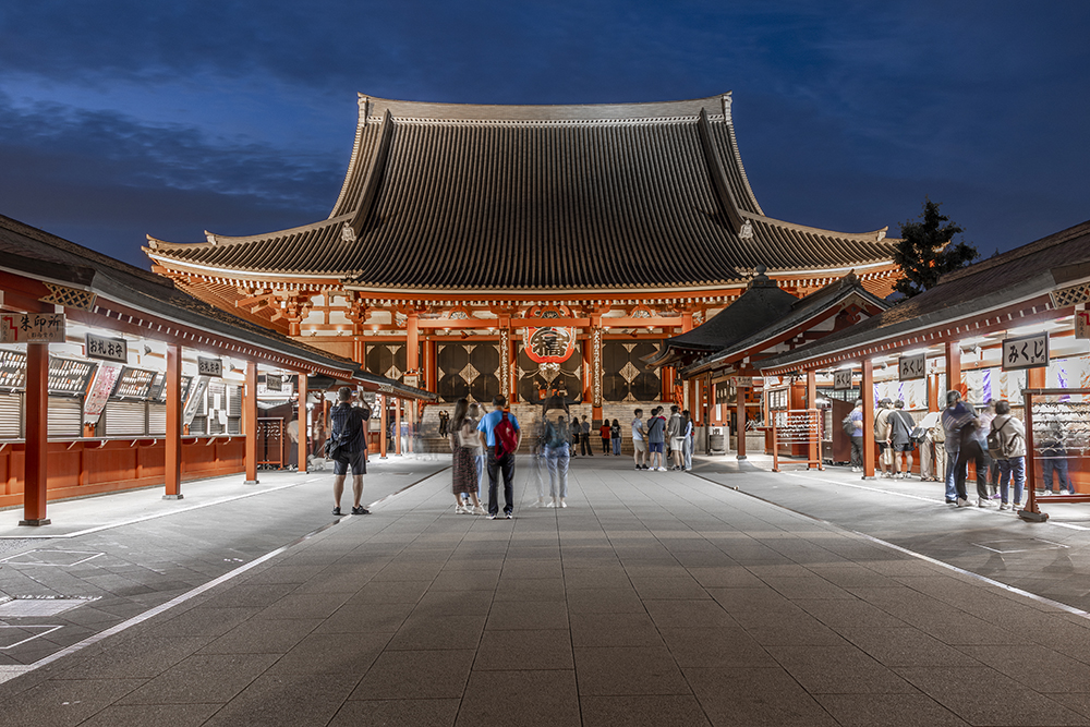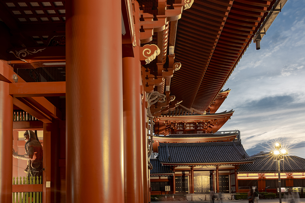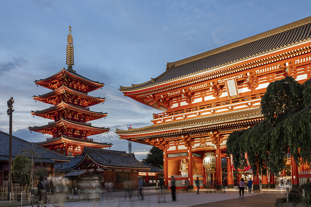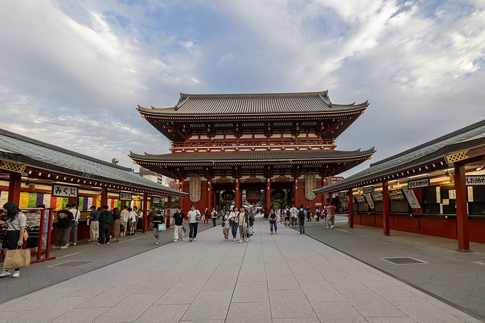 Сенсоджи е най-старият храм в Токио. По време на Втората световна война е бил разрушен, но през 1958 г. е напълно възстановен в пълният си блясък. Известен в цяла Япония, това е храмът на Авалокитешвара Бодхисатва, който въплъщава милостта на всички Буди. Привлича 30 милиона поклонници всяка година. Пет етажната пагода е възстановена през 1973 г. Всички сгради в комплекса са построени отново благодарение на дарения.