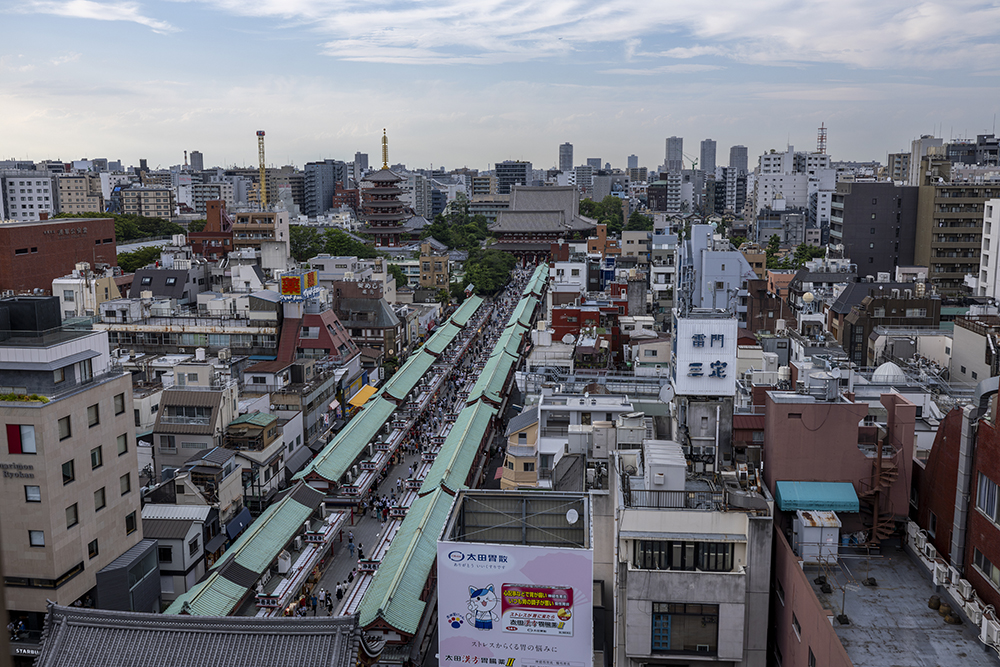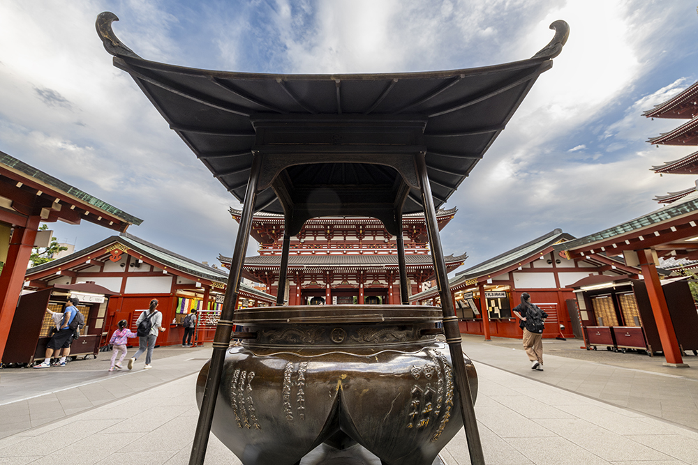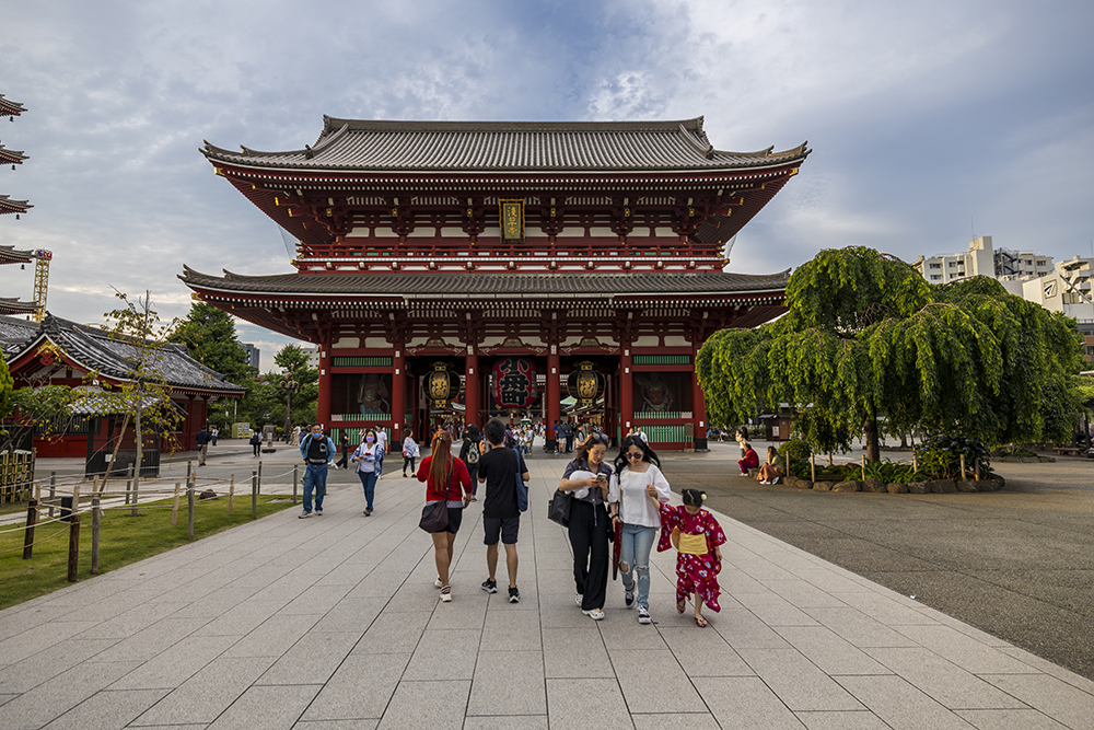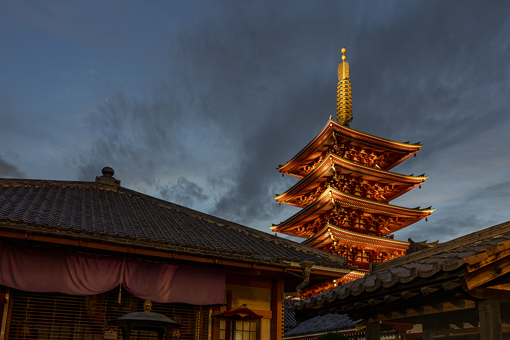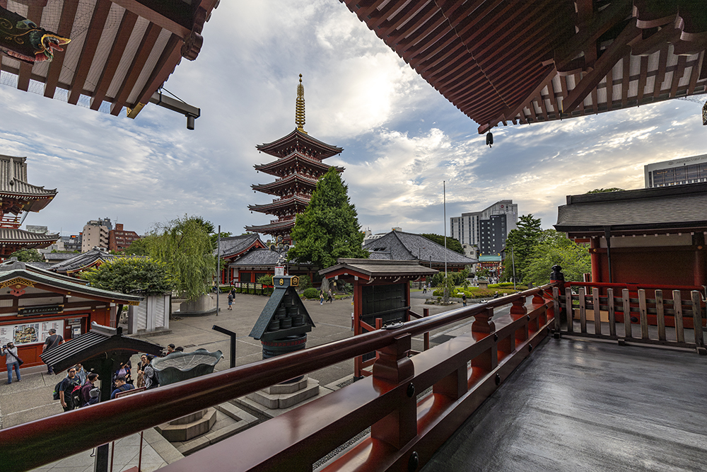 Сенсоджи е най-старият храм в Токио. По време на Втората световна война е бил разрушен, но през 1958 г. е напълно възстановен в пълният си блясък. Известен в цяла Япония, това е храмът на Авалокитешвара Бодхисатва, който въплъщава милостта на всички Буди. Привлича 30 милиона поклонници всяка година. Пет етажната пагода е възстановена през 1973 г. Всички сгради в комплекса са построени отново благодарение на дарения.