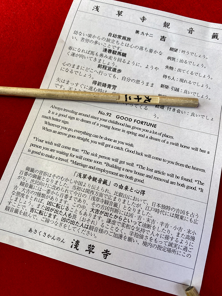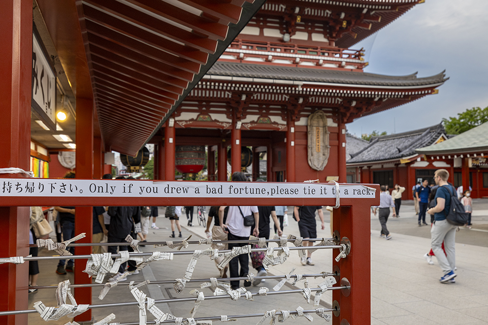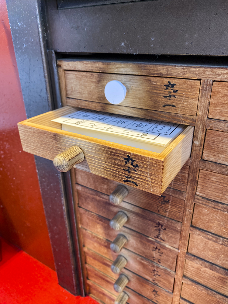 Точно преди главната зала има постройка, в която има много малки чекмеджета пълни с късмети. В метална кутия с малка дупка има тънки дървени пръчици, на всяка има надпис. Разклащате добре кутията и след като си изтеглите клечка, трябва да намерите чекмеджето със същия надпис. Ако не знаете японски, това е най-голямото предизвикателство. Но е забавно.