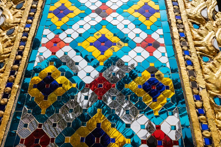 Долната част на ходилата е покрита с инкрустации от седеф, които описват 108 щастливи знаци, разкриващи просветения.