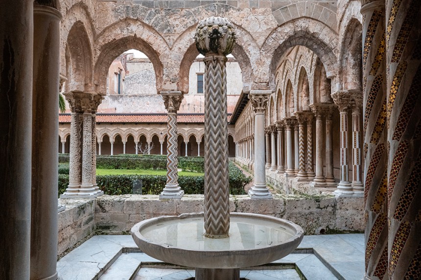 Залепена към южната страна на катедралата е манастирската обител. Основно място на монашеския живот през вековете, днес това е много важен паметник и едно от най-добре запазените свидетелства за нормандското изкуство на Запад. Датира от същия период като самата църква (следователно края на XII век) и е заобиколен от различни сгради, които са част от манастирския комплекс. Неговият квадратен план е с размери 47 метра на страна, с портик, очертан от заострени арки, държан високо от двойки тънки колони. Арките са подчертани от два украсени корниза, подобни на тези, които вече се виждат на фасадите и в областта на апсидата, и се отличават с изпъкнал интрадос, който с допълнителното си оребряване изпълнява практическата функция на носещи конструкции от дърво или друг материал (които предпазват от лошо време и слънчева светлина). В югозападният ъгъл е има възхитителна малка структура, известна като Chiostrino (малка обител), която включва истинско чудо: така нареченият Fontana del Re (Фонтанът на краля). Големият площад е белязан от една централна и четири странични цветни лехи, в които дори подборът на дървесните видове е внимателно обмислен. В центъра има красива палма – символ на победата и мъченичеството, листата й са представени от мозайките в катедралата. Нещо повече, тя загатва за онези, които са достигнали рая, като са показали вярата си в жертвения агнец. Нарът е храст, който произхожда от Персия и е цитиран многократно в Библията, по-специално като един от плодовете на Обетованата земя, като украшение върху дрехите на първосвещеника, в украсата на храма на Соломон и в много пасажи от Песен на песните. За древните отци на Църквата това е символът на градината, многократно споменавана в Библията. Смокинята е друго дърво с древен произход, което предлага храна на човечеството от незапомнени времена. Появявайки се отново и отново в Библията, той напомня за Едем и е символ на просперитет и образ на обръщане. И накрая, има маслиново дърво: изключително устойчив и издръжлив вид, то е символ на мира от времето на Потопа, когато гълъбът донесъл маслиново листо на Ной – епизод, който също е представен в мозайките в катедралата. Маслината напомня за градината, в която са се случили Страстите Христови и често е наричана един от плодовете на Обетованата земя, както и като изключително важен сакраментален знак.