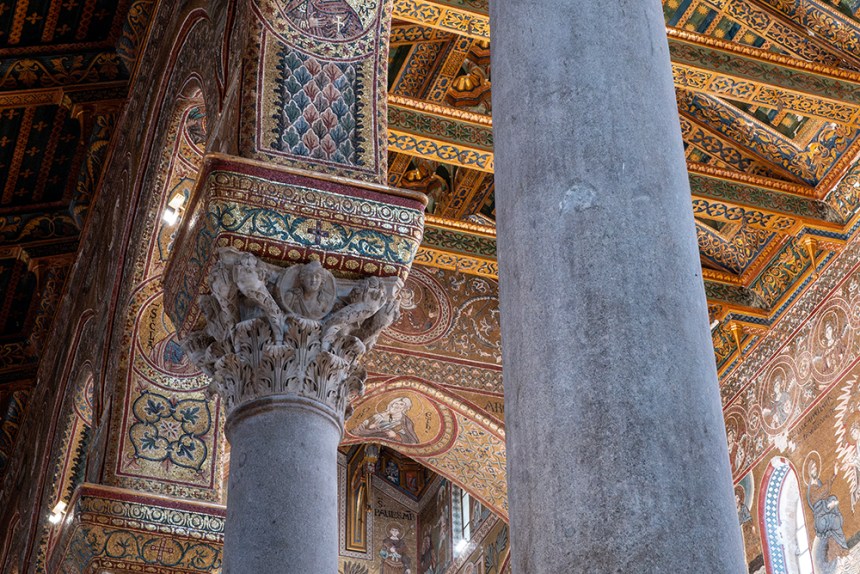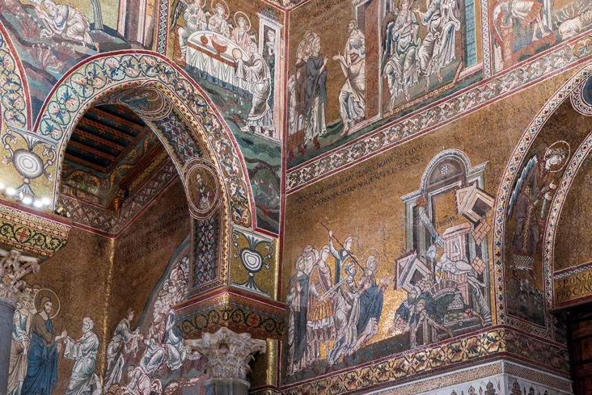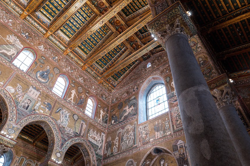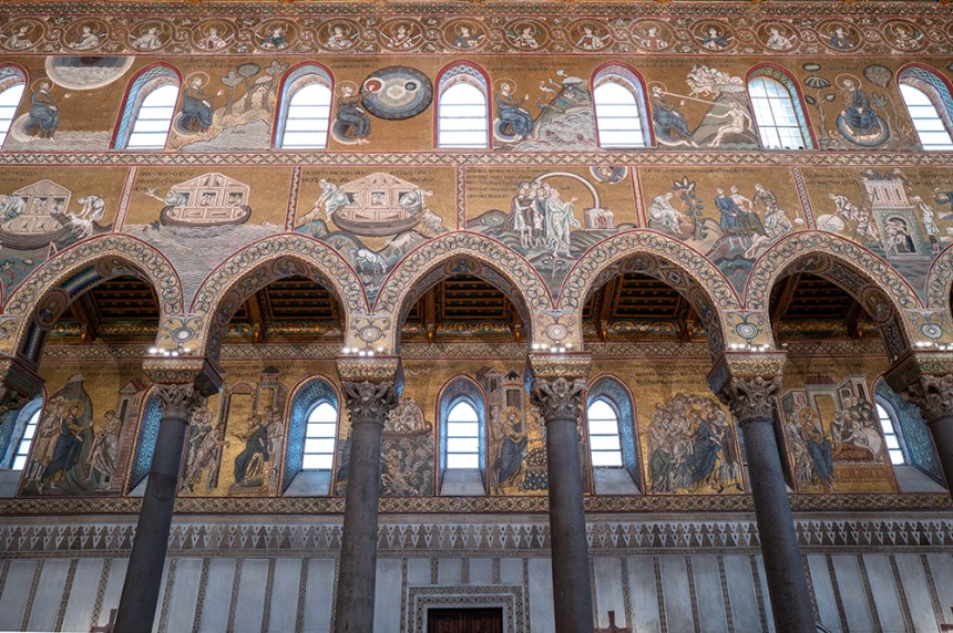Ансамбълът от оригинални части е плод на много специфичен, обединен теологичен/художествен проект, който разкрива приноса на духовници със способността да измислят очарователни начини на културно изразяване, водени от ясното намерение да образоват вярващите, а също и от необходимостта да ги информират за качествата на нормандската монархия. За тази цел трябва да се отбележи, че всяка сцена, изобразена в мозайките, е придружена от надпис, съдържащ един или повече стихове, взети от Библията, тъй като това показва присъствието на свещеници или монаси, способни да предложат подробен библейски маршрут на богомолците. Религиозните фигури са работа в тясно партньорство с един или повече архитектурни дизайнери, под ръководството на кралски възлагащ орган с добре дефинирана идея за изкуството като начин на изразяване, чрез паметници и изображения, на точна концепция за религия, власт и общество. Това свещено пространство, преливащо от красота и блясък, води всеки, който влезе в него, в едно много дълбоко преживяване в емоционален, естетически и интелектуален план. Макар и унифициран, дизайнът все още остава място за себеизразяване на различните занаятчии с различен произход, съставляващи мозайката на нормандското кралство: арабски, византийски, латино-християнски и северноевропейски. В този смисъл осемнадесетте колони (изработени от гранит и мрамор), включващи коринтски капители, произхождащи от сграда от римската епоха и увенчани с досерет във византийски стил, изцяло покрити с мозайки, представляват сами по себе си интересен синтез, защото тяхното подреждане привлича погледа на посетителя към апсидалния свод, доминиран от внушителната фигура на Христос Пантократор, което означава „всемогъщият, който управлява всичко“. разположен над олтара и мястото, запазено за духовенството и царя.