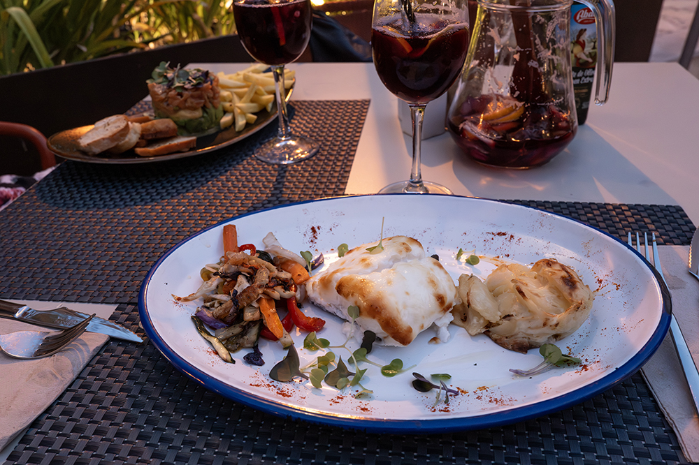 За вечеря седнахме в ресторант точно до крепостната стена, който се оказа превъзходен. Започнахме с ароматна и студена сангрия за добре дошли. Стриктно спазваме правилото, ако си в Испания, прави каквото правят испанците. 🙂