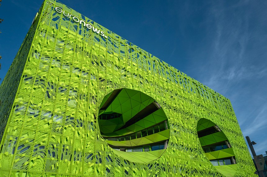 Проектът на Euronews е замислен като разтегнат куб, пронизан от два конусовидни атриума, които вкарват дневна светлина, въздух и осигуряват гледка към реката за ползвателите на сградата. Тези атриуми са представени като две гигантски очи, гледащи към реката и нейната околна среда. Символично, очите представляват и тези на Euronews, абстрактни рецептори, улавящи събитията от света около нас. Образ, който резонира с ролята на наблюдател на световните събития, свързана с новинарския канал.