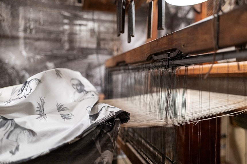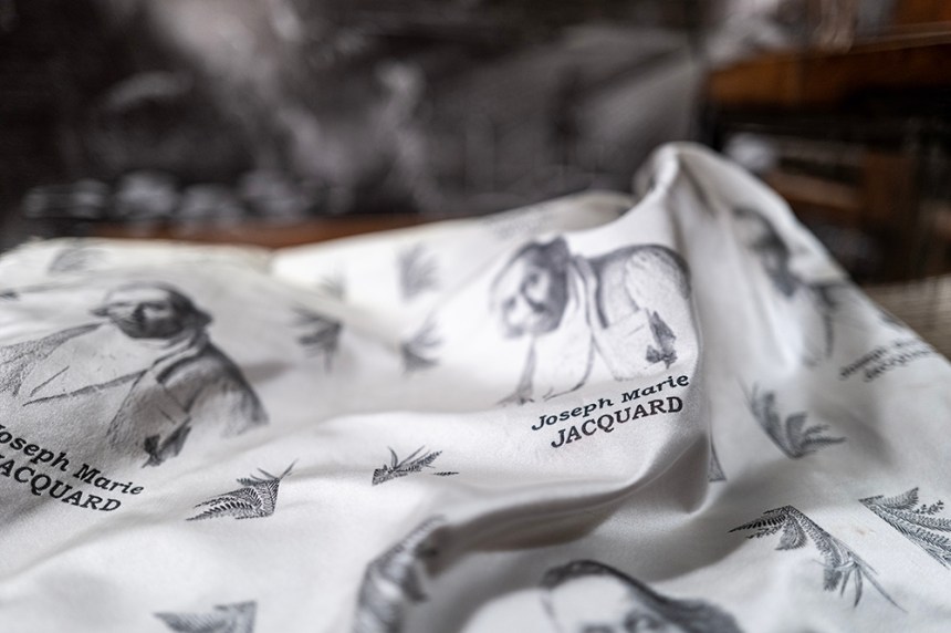 В дъното на този магазин има стар стан и коприна с лика на Жозеф Мари Жакард – създателят на Жакардовия стан.