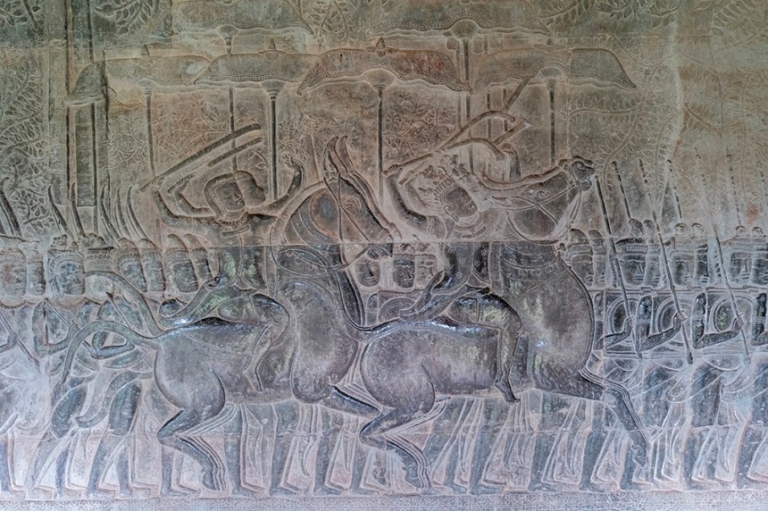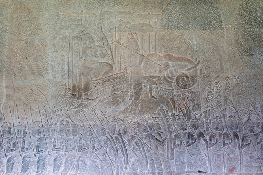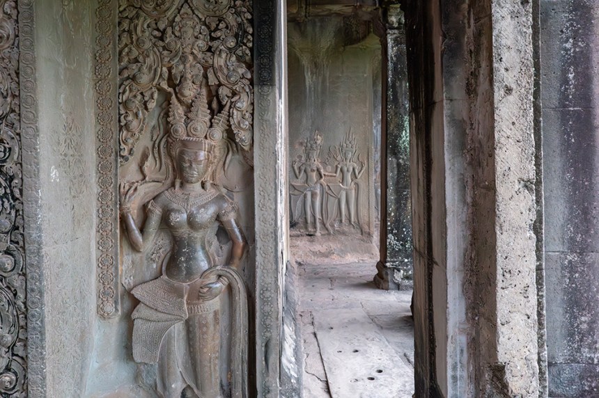 Самият храм е върху варовиков пиедестал, леко повдигнат над земята, сякаш отделен от обикновения свят. По периметъра му се извиваха балюстради с наги, които придаваха усещане за защита и свещеност. Външната стена на храма се нарича „третото ограждение“ и е разположена върху пиедестал с височина над три метра. Докато вървяхме покрай нея, следвахме непрекъсната галерия, а щом влязохме вътре, се потопихме в друг свят – 700 метра барелефи, разказващи митове и битки, изсечени в камъка с удивителна прецизност. Имах чувството, че тук стените говорят.