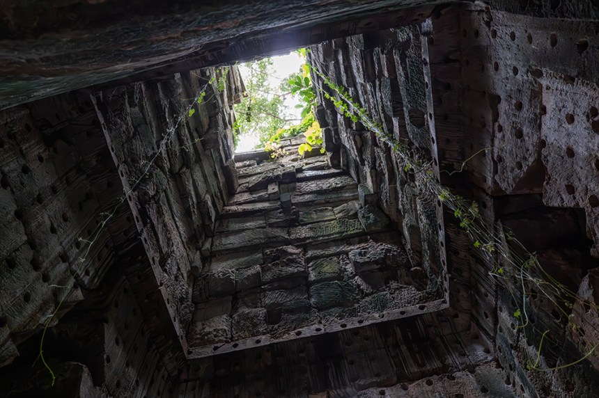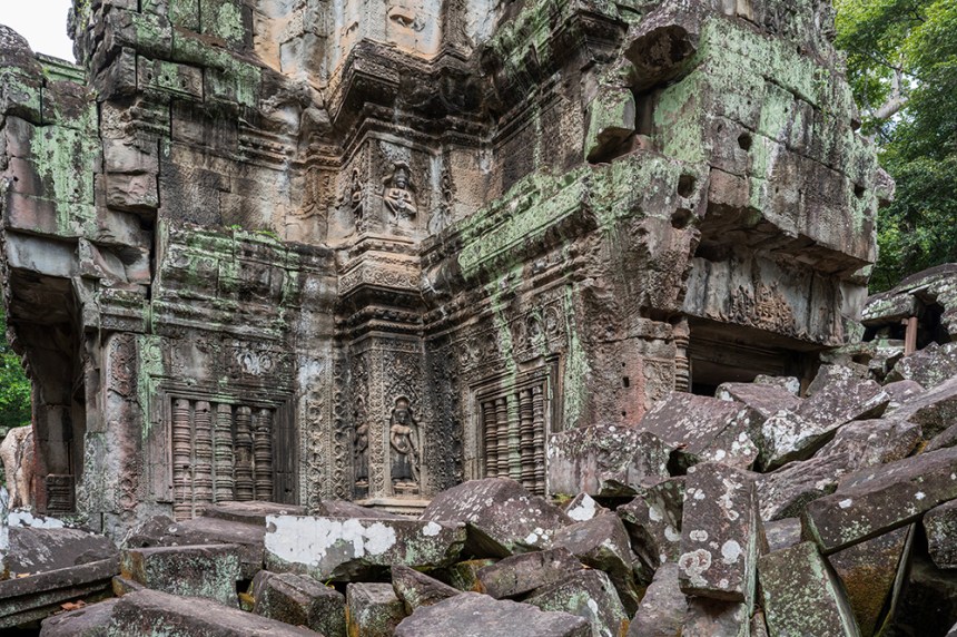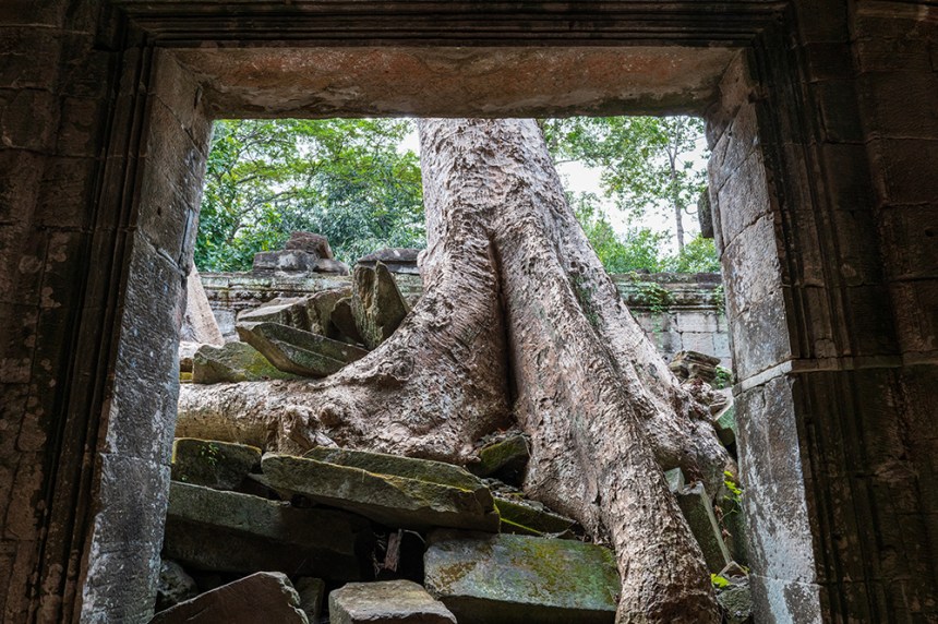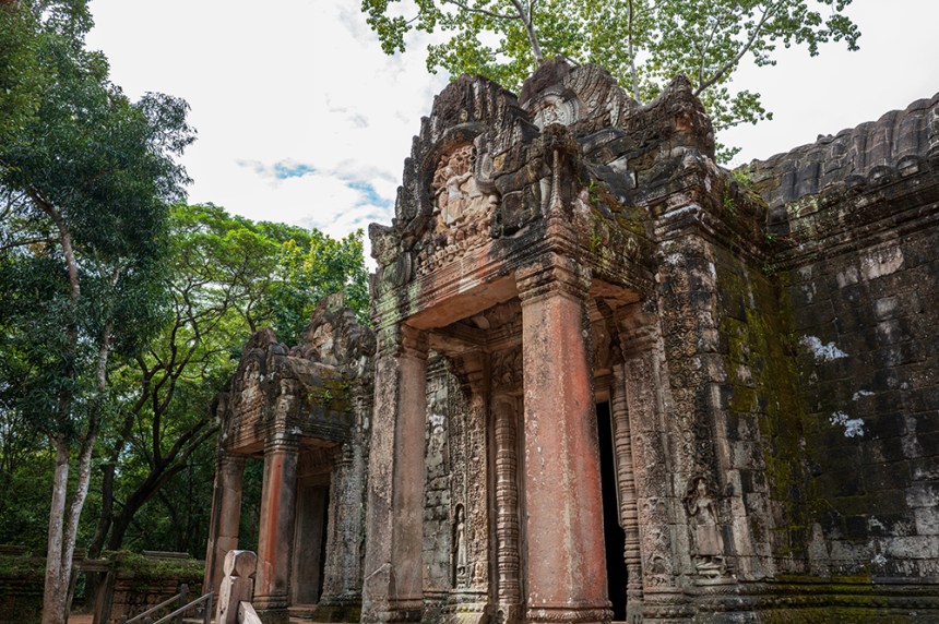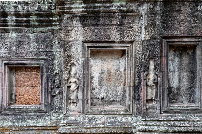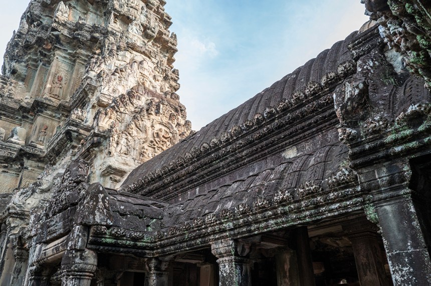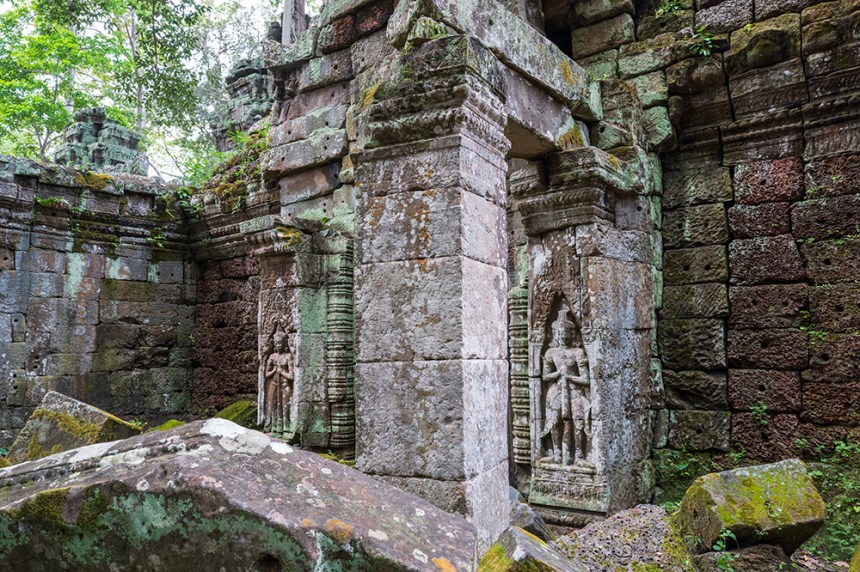 По стените барелефите са почти скрити под лишеи, мъх и пълзящи растения, а от покривите на монументалните веранди никнат храсти. Над нас се извисяваха стогодишни дървета, чиито корони филтрираха слънчевата светлина и обгръщаха храма в мек, зеленикав полумрак. Имах чувството, че джунглата и камъкът отдавна са станали едно цяло.