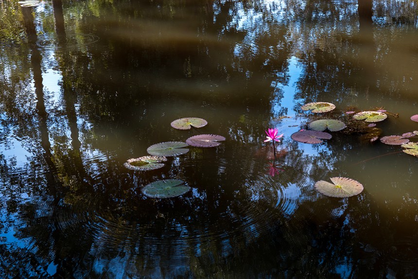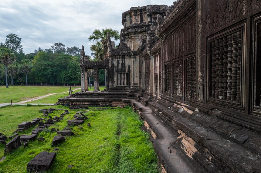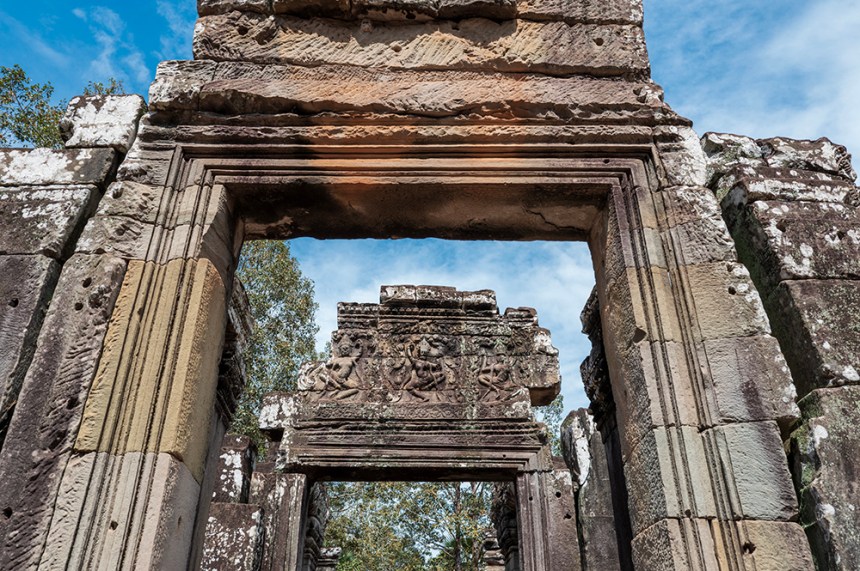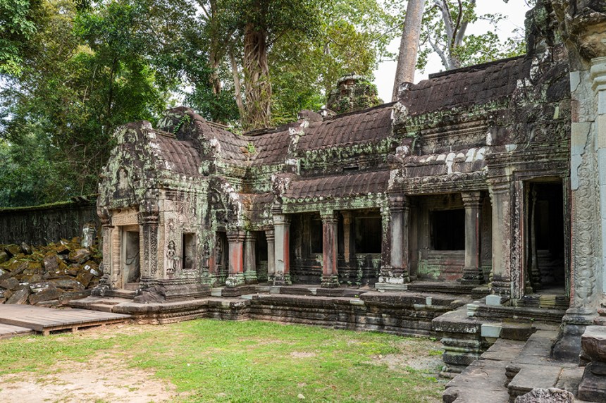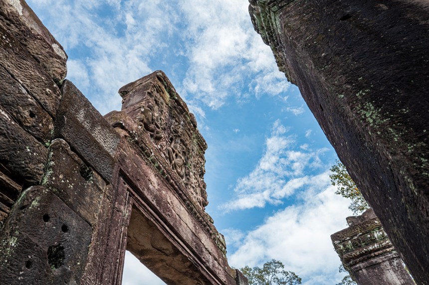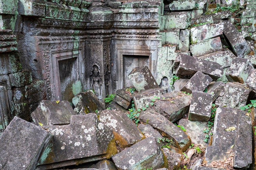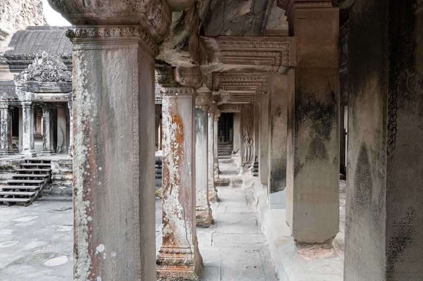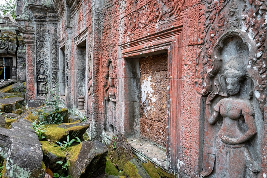 По стените барелефите са почти скрити под лишеи, мъх и пълзящи растения, а от покривите на монументалните веранди никнат храсти. Над нас се извисяваха стогодишни дървета, чиито корони филтрираха слънчевата светлина и обгръщаха храма в мек, зеленикав полумрак. Имах чувството, че джунглата и камъкът отдавна са станали едно цяло.