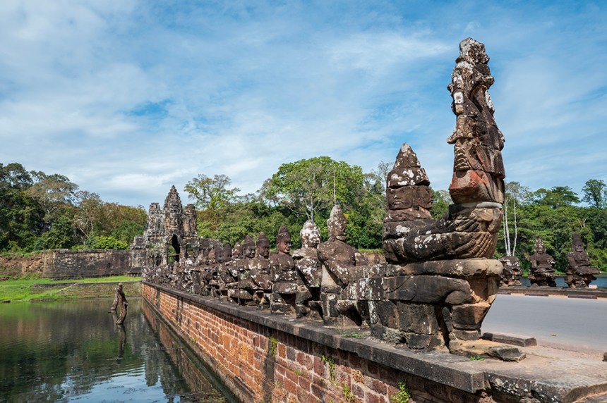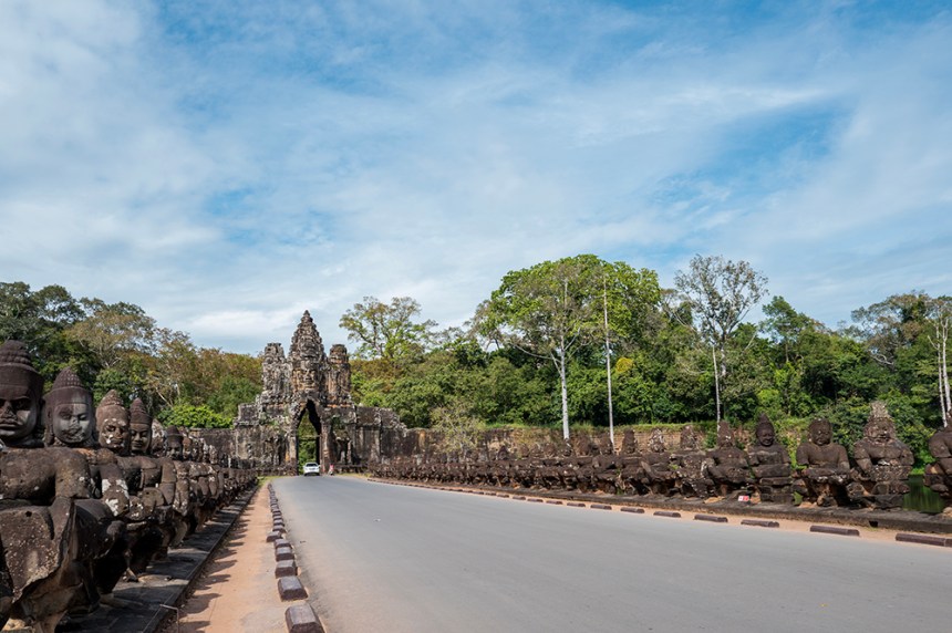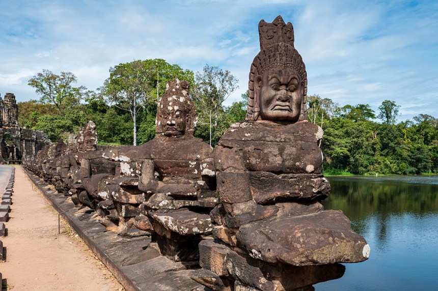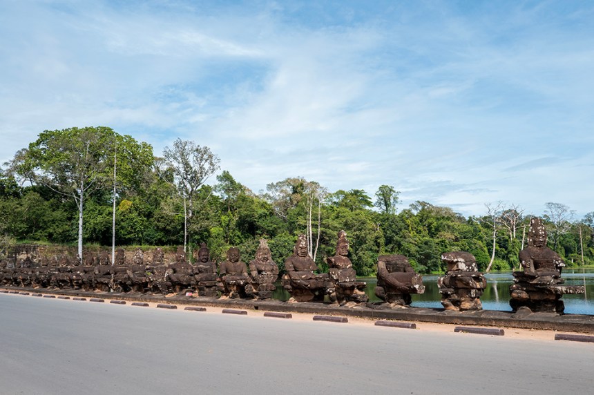 Южната порта – най-добре запазената от всички, прави доста впечатление. До нея се стига по път над рова, а от двете ѝ страни каменни фигури пресъздават древния мит за разбъркването на океана. Отляво боговете, отдясно демоните, всички вплетени в едно напрегнато движение около гигантската змия. Докато минавах между тях, имах чувството, че участвам в космически ритуал, в който се създава самият свят.