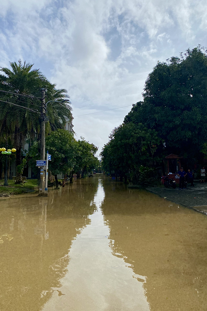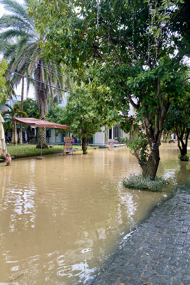 Последната сутрин в Хой Ан, пихме кафе в едно от крайбрежните кафета. В центъра на града водата беше заляла всичко. Момичето на бара ни каза, че до 2 часа и пред кафето ще стигне водата. На майтап си казахме, че имаме време да си изпием кафето и да се приберем по суша до хотела. Така и стана. След като приключихме с кафето, пред заведението все още беше сухо, но водата вече излизаше от коритото си. Но, най-интересната и неочаквана част беше улицата пред хотела ни. Всичко беше под вода.