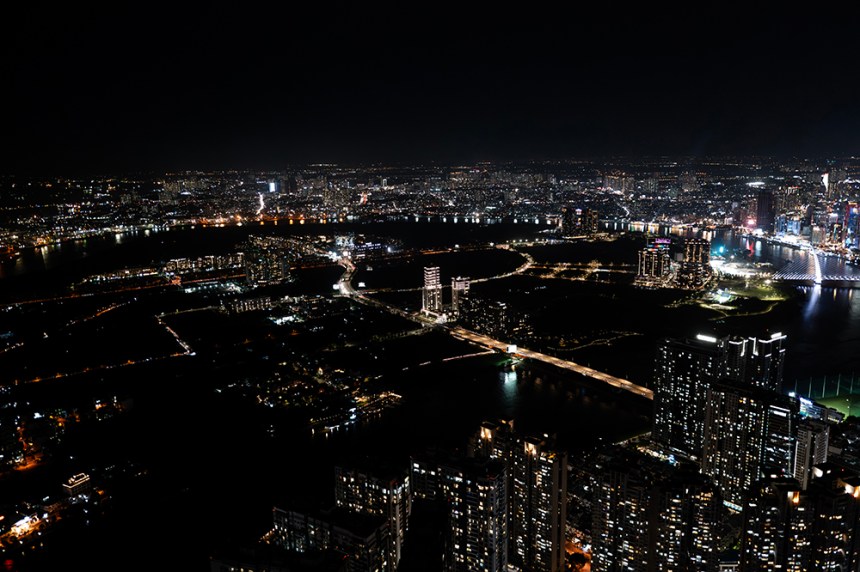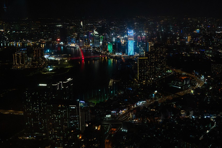 Когато се качихме на терасата, пред нас се разкри вечерен Сайгон – безкраен, пулсиращ, разлят до хоризонта. Река Сайгон се виеше като тъмна лента между сградите, а мостовете приличаха на фини нишки, свързващи кварталите. Гледката не беше просто „панорама“. Беше усещане за мащаб. Стъкло, бетон, неонови светлини, покриви, кули – градът се разгръщаше на пластове. В далечината високите сгради блестяха, а по-ниските квартали изглеждаха като безкрайна мозайка.