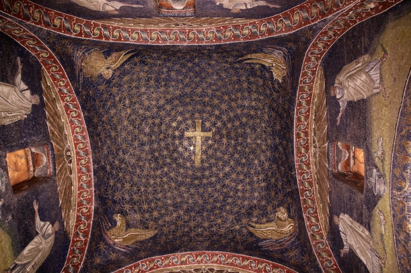 By: Travel ME август 23, 2017август 30, 2017 Една от най-красивите мозайки в мавзолея на Гала Плачидия е на нощното небе, в чийто център има златен кръст (символ на Христовото Възкресение), около който в концентрични кръгове се въртят 570 златни звезди.