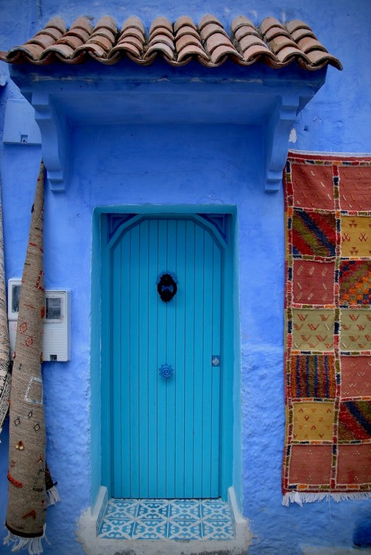 Малка спретната врата с два килима отпред.