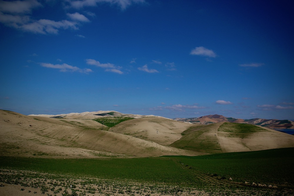 Обработваеми земи на фона на ниски планини.