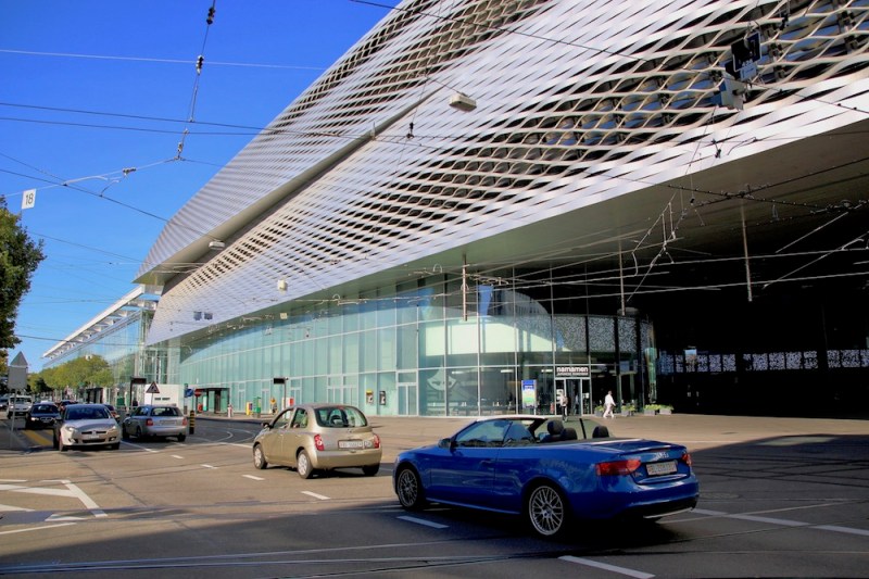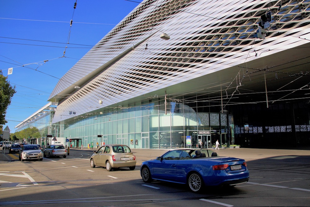 Пред сградата на панаира в Базел.